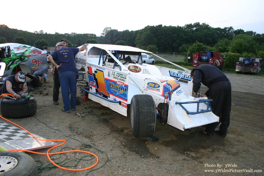 Crew member helps Modified driver Tommy Carberry back up from his pits stall... These things don't have mirrors!