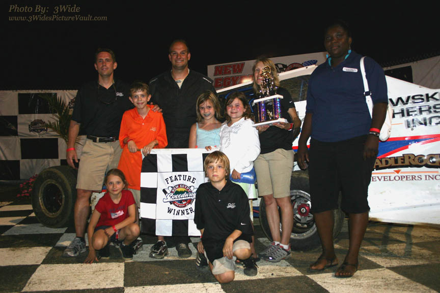Representatives from night sponsor C&M Automotive Warehouse join Rocco in victory lane.