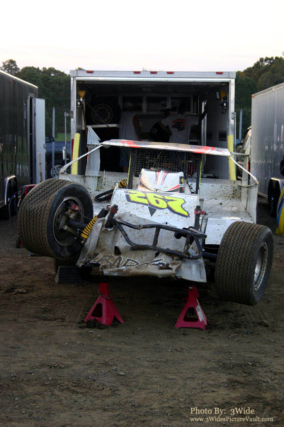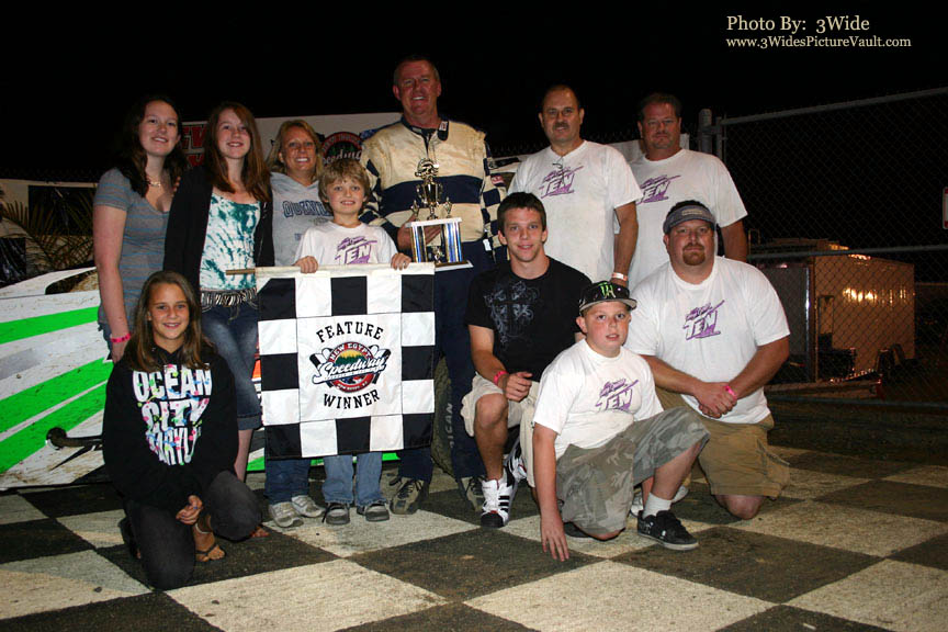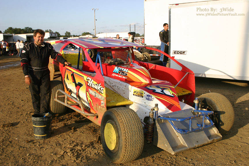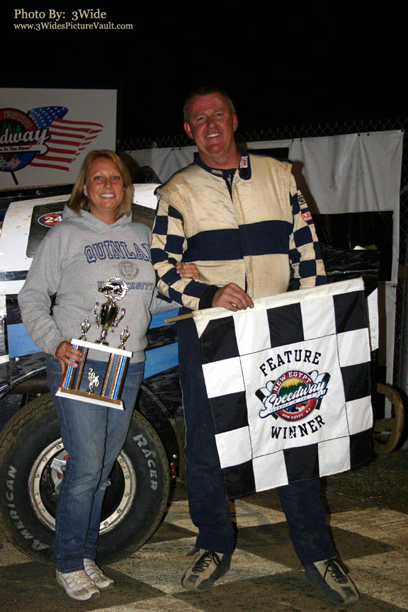 ...and as for the Modifieds... Here Billy Pauch victoriously climbs from his #1 after passing Ron Jon Kozcon with less than 5 to go...