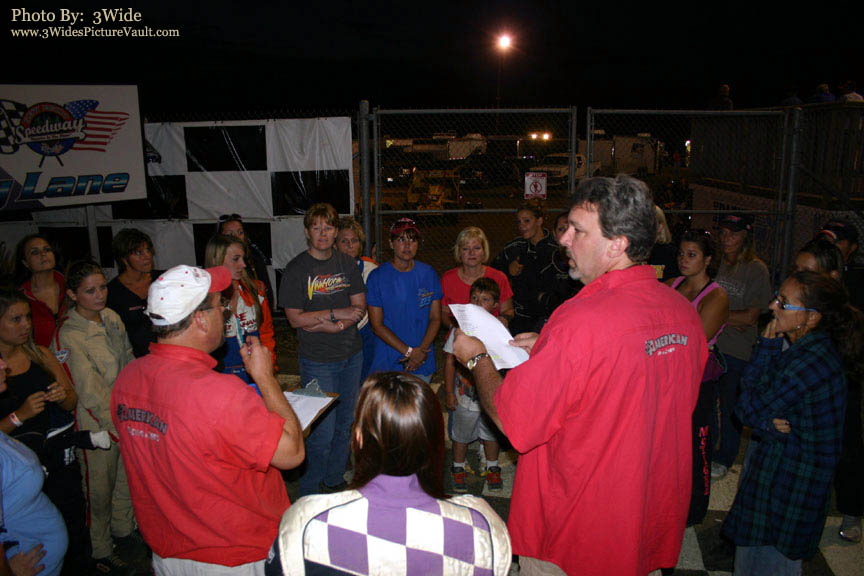 Race Director John McCaughey and "Clerk of the Course" Doug brief the Powder Puff driver's prior to their events.