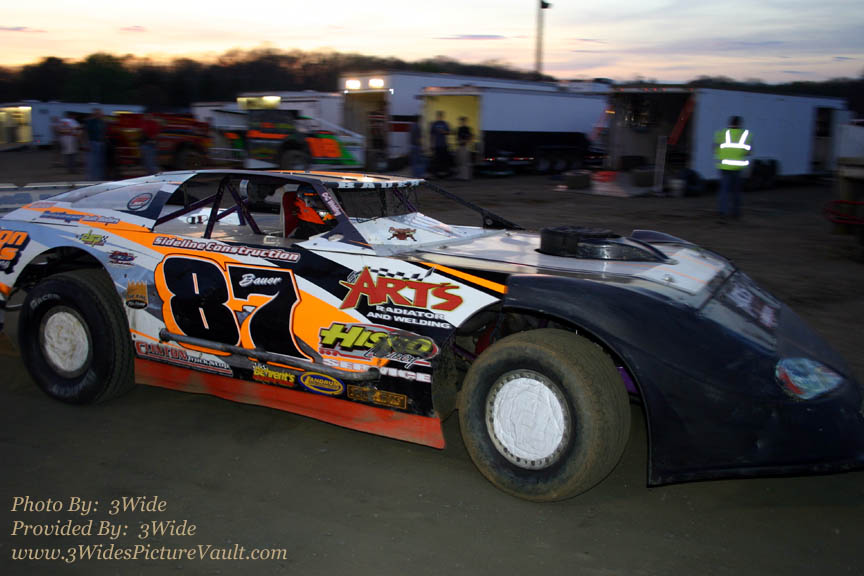 Bill Bauer heads out for the Super Stock Feature. (He'd later have contact with the #119 of Rob Ormsbee while battling for the lead with Ormsbee then spinning in turn 2. Track officials put the #87 to the rear for over aggressive driving which put him right along side of the #119. While under yellow, the #119 drilled the #87 resulting in Ormsbee being parked for the rest of the night, plus an additional event (in 2 weeks). Bauer stayed on the track and was able to work his way through the pack and went on to finish 4th.)