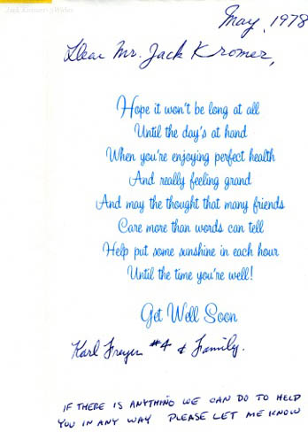 The ambulance guy kept asking me who I was and where was I? He asked again- what is your name? I answered, “I don’t know.” Where are you? “I don’t know.” That really scared me. I never had that feeling of not knowing who I was, before. Then, he gave me a hint and asked if I was Jack. “Yes, yes” I replied. What’s your name, he asked? “Jack Kromer”. Where are you? “Flemington Speedway”, I answered. The ambulance attendant replied, “That’s right. Okay, very good, that’s better.” Man, that made me happy that I knew something, finally. Weeks later I prayed. “Please don’t let me ever wake up again and not know who I am or where I am.” That held up so far, except one time it almost didn’t.