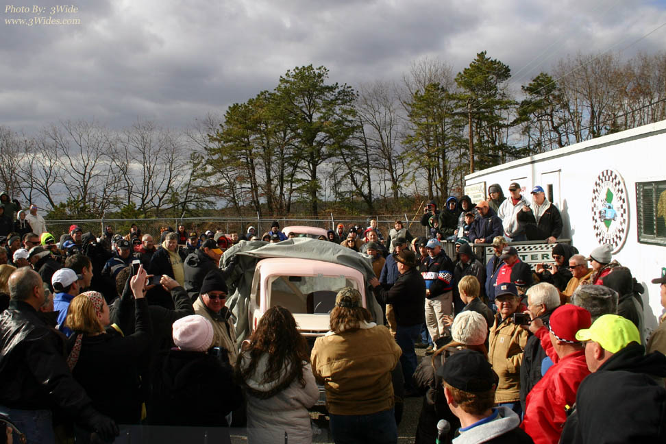 Time for the unveiling... Wally Sr. grabs one side of the cover while Ray