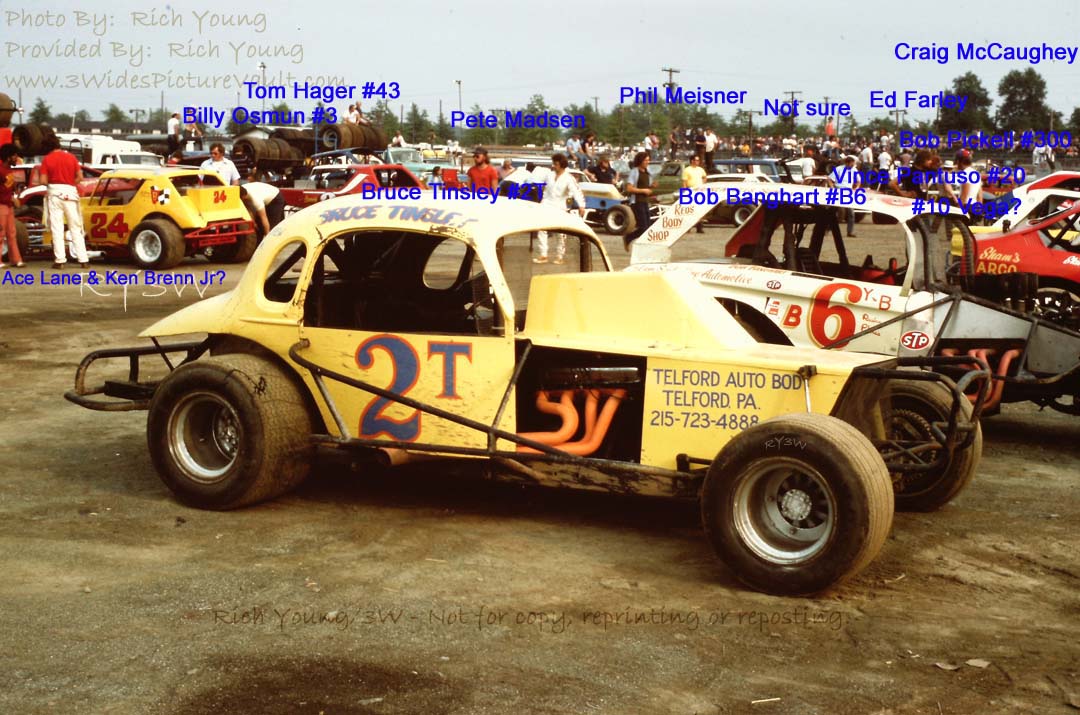 Bruce Tinsley. We used this picture for a trivia question and some of the other cars in the background that you came up with include Bob Banghart's #B6, (Not sure about the red Vega that might say "Stan's Arco" on it), Vince Pantuso's #20, Bob Pickell #300, Ken Brenn Jr's #24, Both Statewide #3 cars driven by Billy Osmun, Tom Hager #43, Pete Madsen #111, Phil Meisner @17, (not sure of brown car), Ed Farley #26 and Craig McCaughey #301. |
