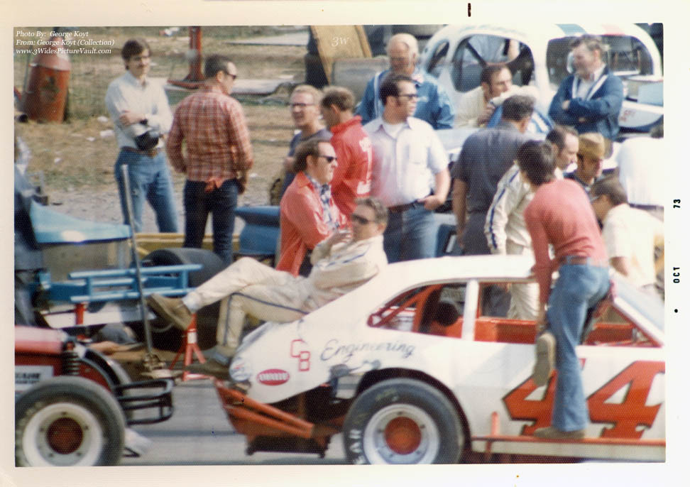 Photo ID # I11.22.12_044_OLS_TRN_0074K_1 Car #: #44 Driver (s) : Budd Olsen Location: Trenton NJ Date: 1973 Photographer: George Koyt Photo provided by: George Koyt Comments: Comment: Looks like Budd Olsen relaxing on the back of the C&B Engineering #44. Although I haven't seen it in quite a while, this car is still around and when I last saw it, was at a vintage event with owner Alan Jensen. Not sure who the other driver is in the photo.