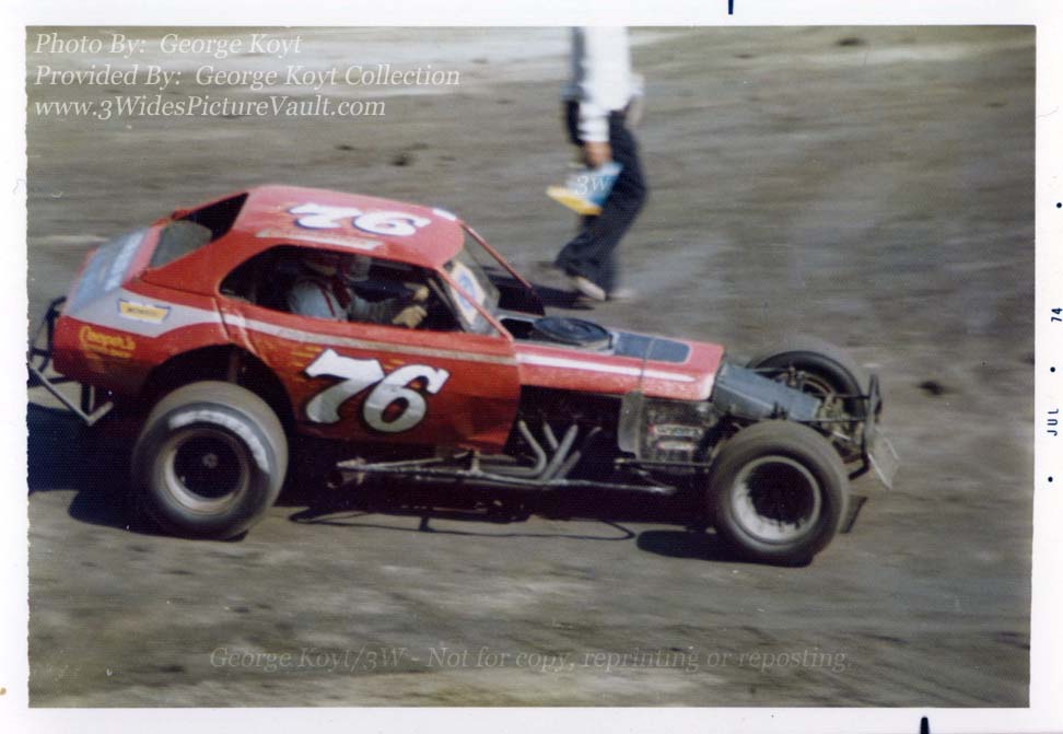 Photo ID # L12.01.15_076_CHA_SYR_0774KOYT_1 Car #: #76 Driver (s) : Gerald Chamberlain Location: Syracuse Date: 1974 Photographer: George Koyt Photo provided by: George Koyt Comments: Comment: The Pinto never got as much love as the Falcon, but looking at it now, it's a pretty cool ride! Looking at Gerald with the helmet with the bubble shield, it reminds me of a story that Ray Neary told me... He was running on the big track at Nazareth at high speed, and he hears a car coming by on the outside... as he turned to look the wind caught his bubble shield and ripped it right off the helmet, leaving him with a face full of dirt and dust as Frankie Schneider went motoring on by! Hopefully Gerald kept his head pointed straight ahead and the bubble shield in place going down the straight's at Syracuse.