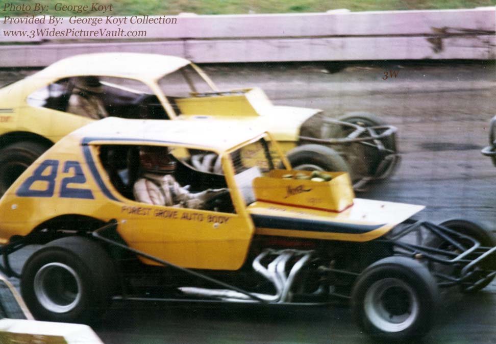Photo ID # L12.06.15_082_WIL_FLM_0776TKOYT_1 Car #: #82 Driver (s) : Randy Wilmore Location: Flemington Speedway Date: July, 1976 Photographer: George Koyt Photo provided by: George Koyt Comments: Comment: I don't remember Randy being a regular at Flemington Speedway. This might have been a special show as Randy, with small block power, is lined up alongside of Freddy Dmuchowski with big block power under the hood of the #303.