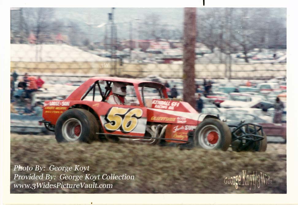 Photo ID # M08.20.16_056_BAK_REA_0375KOYT_1 Car #: #56 Driver (s) : Jim Baker Location: Reading Date: 03/16/75 Photographer: George Koyt Photo provided by: George Koyt Comments: Comment: Really great looking modified. Picture is dated 03/16/75. Not sure if it was this year, but I remember seeing this car totally destroyed on the cover of AARN at an opening day event with driver Jim Baker I believe receiving a broken leg in the accident.