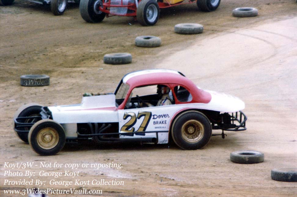 Photo ID # P07.05.19_027_AMY_NAZ_0073_1 Car #: #27 Driver (s) : Leroy Amy Location: Nazareth Date: 1973 Photographer: George Koyt Photo provided by: George Koyt Collection Comments: Comment: Not sure if it's the way the body sits on the frame, but the wheelbase looks a little long on this one. Cool looking red, white and blue modified with a helmet to match.