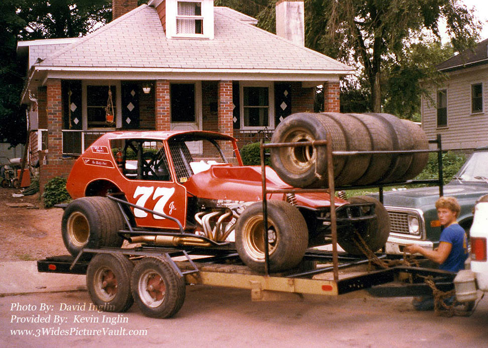 | Comments: | Comment from Kevin: I’m guessing the year is 1979. A young looking Joe checking the chains before towing to either Flemington or the Nazareth small track. The car is sitting in front of our old home on Maple Avenue in Flemington. This might have been one of the first races of the season given the cleanliness of the. The car is sitting on a homemade trailer built from an old boat trailer by my father. Looks like it isn’t finished yet, no covers of the wheels. This was a Burnett chassis formerly driven by Chuck Carberry with a Mustang body on it. |