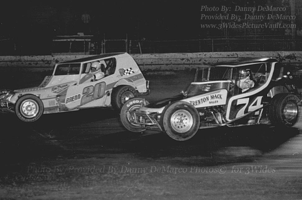 | Comments: | Stan Ploski takes a look on the inside of Jimmy Brenn in turn 2 modified action at Flemington Speedway. |