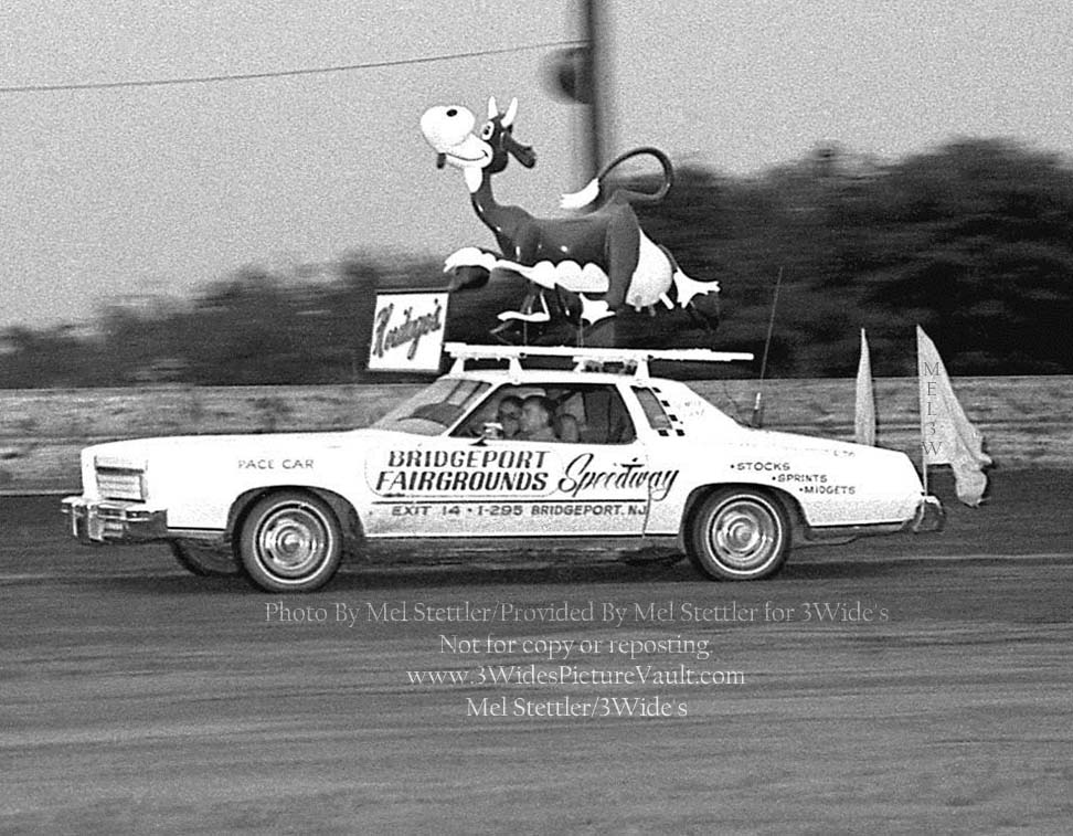Photo ID # Q04.07.20_PAC_CAR_BPT_0080MEL_1 Car #: #NA Driver (s) : not sure... Location: Bridgeport Speedway Date: 1970s Photographer: Mel Stettler Photo provided by: Mel Stettler Comments: Comment for above photo: Looks like the '75 Monte Carlo has a passenger on the roof as part of Heritage's Convenience Stores night at the speedway.