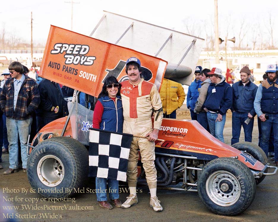 Photo ID # Q05.02.20_012_COL_WIL_0083MEL_1 Car #: #12 Driver (s) : Kevin Collins Location: Williams Grove Date: 1983 Photographer: Mel Stettler Photo provided by: Mel Stettler Comments: Comment from Mel for above photo: Kevin Collins and wife Dawn in victory lane after winning the opener at Williams Grove (1983.)