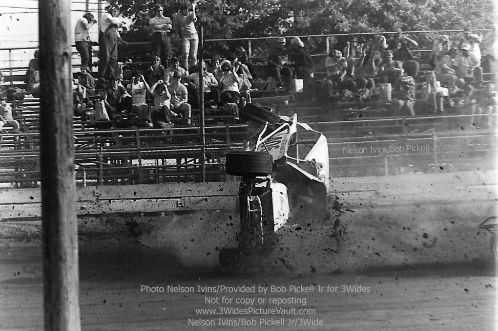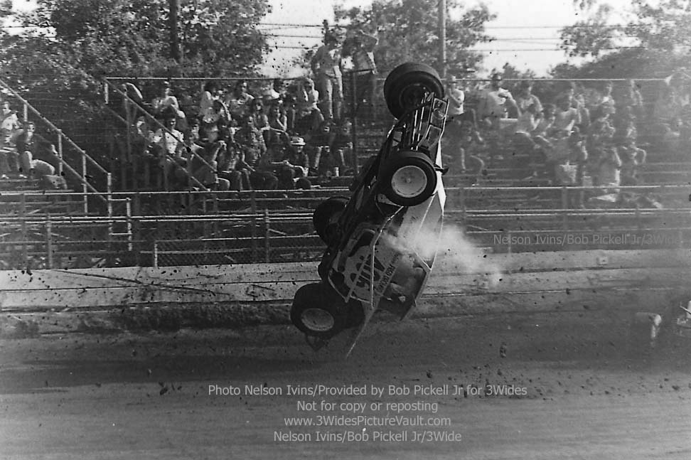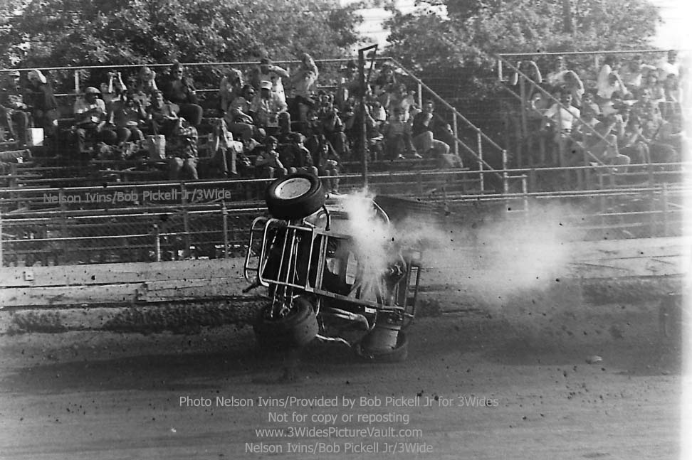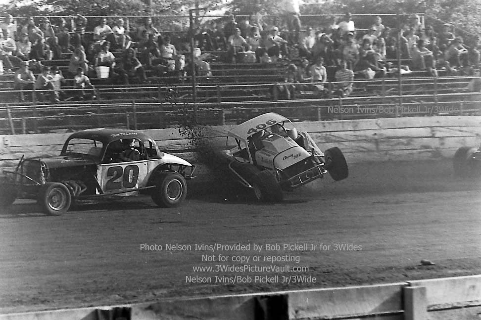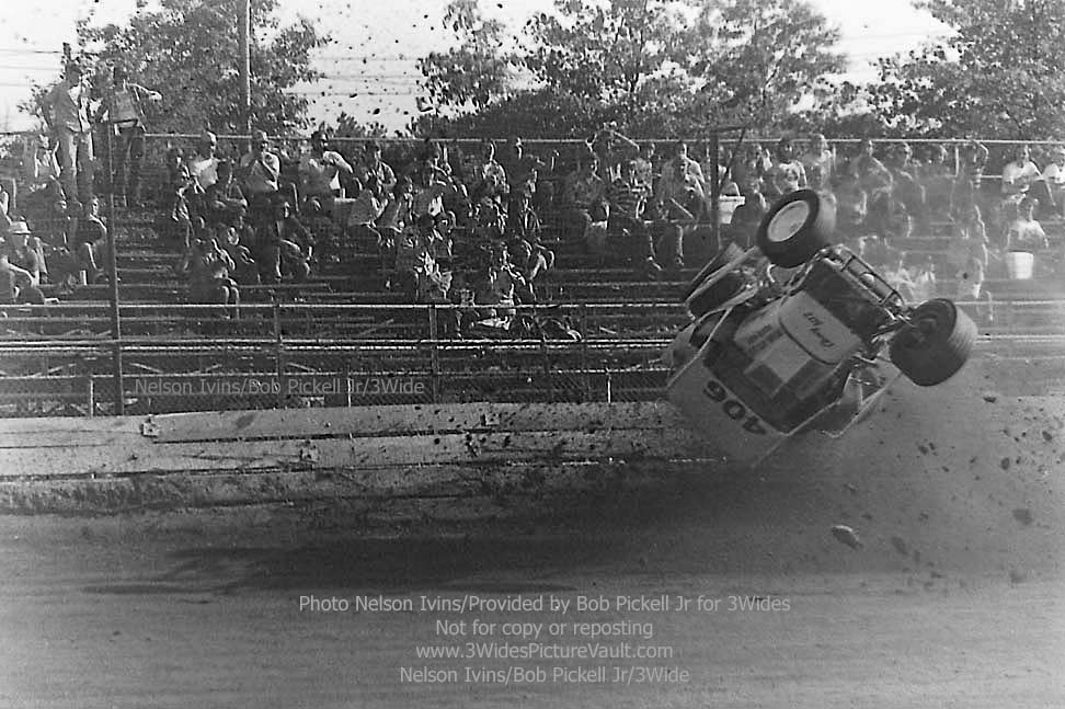 Comment: ...I remember this one well.... Freddy Orchard in the #406 Valiant was in a battle for the lead with Billy Carver Jr during the rookie feature, and as they came into the first turn, contact was made, with Orchard going up and over, and Carver spinning to the inside. (If you look to the bottom right of a few of the images, you can just see the backend of Carver's #1Jr sedan.) One of the reasons I remember this one so well is not only because they were battling or the lead, but also because I was seated in the stands, taking a picture of my own with the trusty Kodak 110 Instamatic... (That's me - 2nd picture down, left side bottom, about 4 rows up. I'm also directly behind the flipping #406 Valiant in the 3rd picture from the top, but totally hidden by the car.) Here's what it looked like from the other side of the fence: https://3widespicturevault.com/70spics&vitals/12.22.02_406_ORC_FLM_0070_1.htm Fred Orchard would race again and would become a modified feature winner later in his career. Image sequence by Nelson Ivins. |