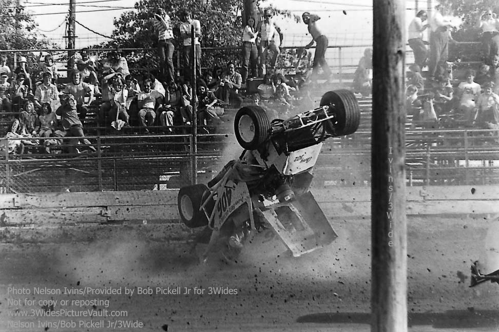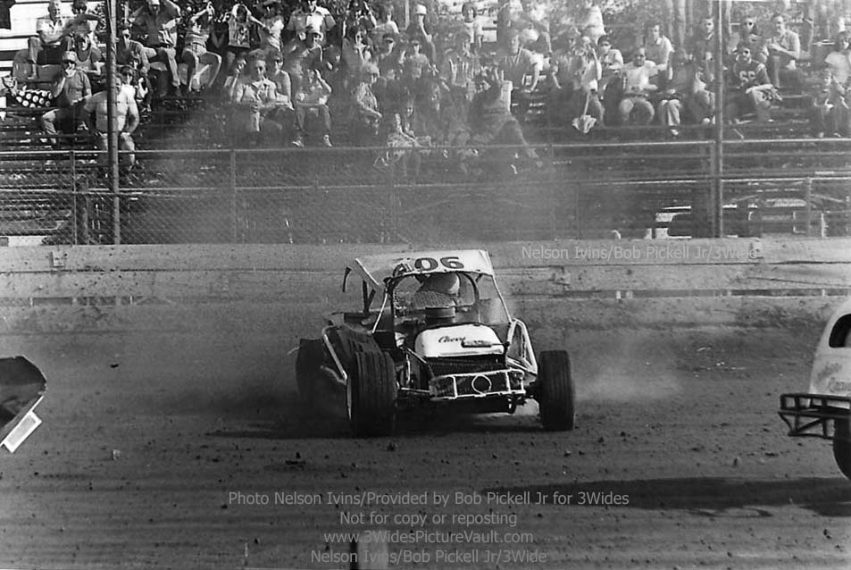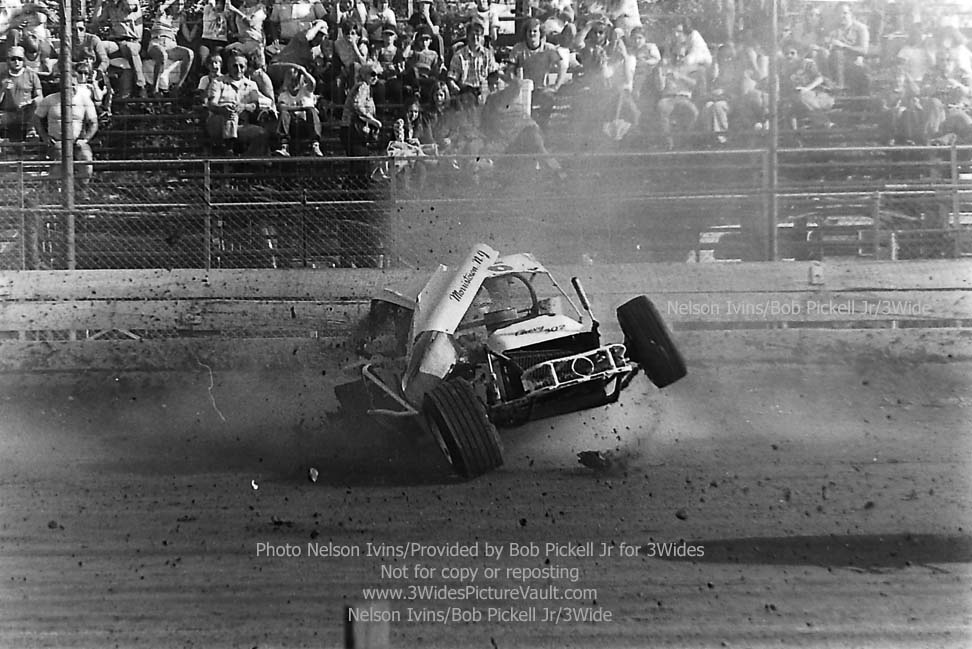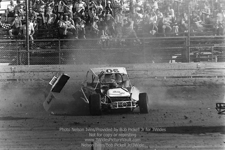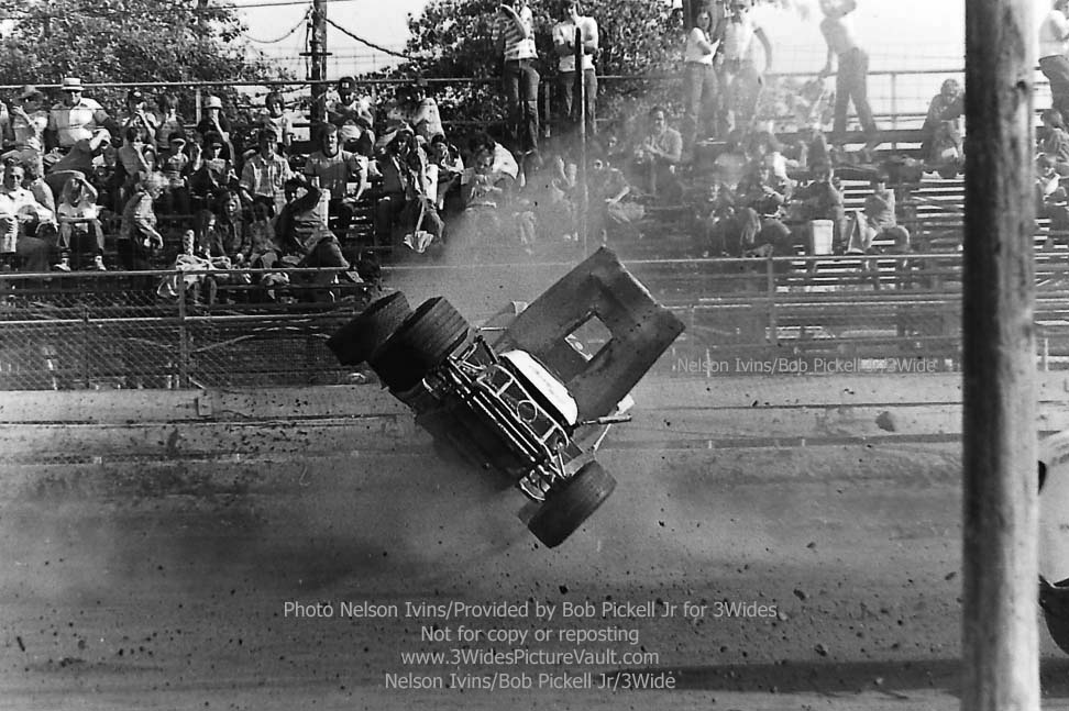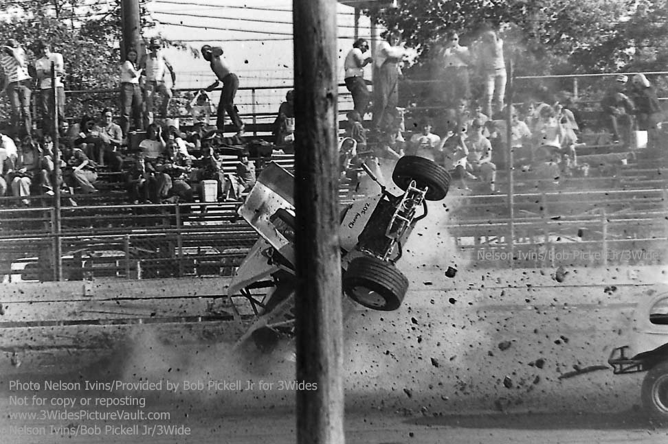Comment: ...I remember this one well.... Freddy Orchard in the #406 Valiant was in a battle for the lead with Billy Carver Jr during the rookie feature, and as they came into the first turn, contact was made, with Orchard going up and over, and Carver spinning to the inside. (If you look to the bottom right of a few of the images, you can just see the backend of Carver's #1Jr sedan.) One of the reasons I remember this one so well is not only because they were battling or the lead, but also because I was seated in the stands, taking a picture of my own with the trusty Kodak 110 Instamatic... (That's me - 2nd picture down, left side bottom, about 4 rows up. I'm also directly behind the flipping #406 Valiant in the 3rd picture from the top, but totally hidden by the car.) Here's what it looked like from the other side of the fence: https://3widespicturevault.com/70spics&vitals/12.22.02_406_ORC_FLM_0070_1.htm Fred Orchard would race again and would become a modified feature winner later in his career. Image sequence by Nelson Ivins. |