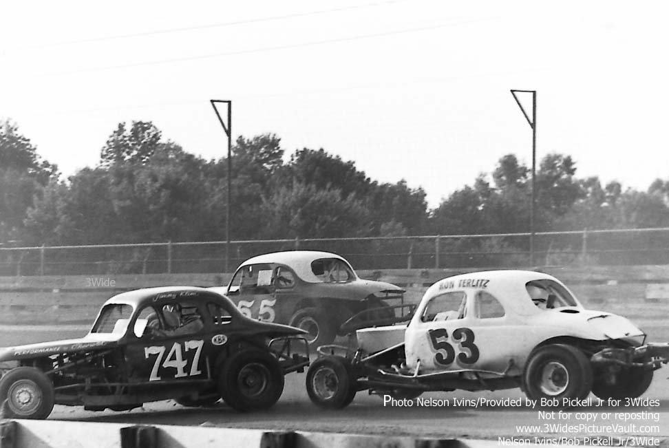 | Comments: | Comment: Jim Klim spins the #747 as the #55 and the 53 try to get by. (Looking at the #53 of Ron Terlitz, I'd say that was another car that was lettered by Jim Baches (the same fellow who lettered the Piscopo #39, the George Taylor owned #93 driven by Don Stives and Dick Havens, the #47 Carberry owned coupe, and others of the day. |