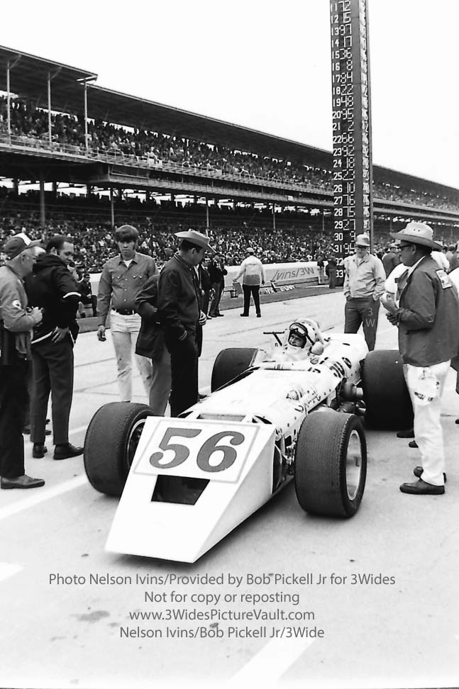 cars of the day. Maybe Jim was making the point twell into the decade of the 70's, that the Indy 500 was supposed to be a representation of American racing, which had strong roots to the short dirt bullrings, to the larger asphalt ovals, and what better way to represent that history than with a front engine machine. The #56 above never made the starting field of an Indy 500, but that doesn't stop us from remembering this historic car, and the man who piloted it. |