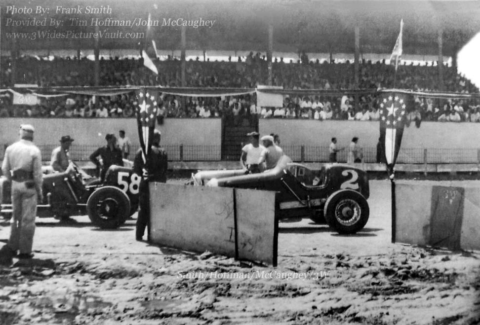 | Comments: | Comment from Tim Hoffman: Getting ready for time trials . Dad is in the back row wearing a white tee shirt on the other side of the #2. All those guys had a big set of stones! Check the stands out - you don't see that anymore |