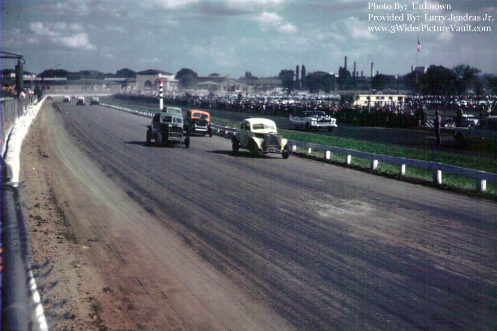 Jendras Jr: Ever since 1972 when the first SuperDirt week was presented and the #00 of Buzzie Reutimann took the win, we think of Syracuse, N.Y. and the New York State Fairgrounds as a October tradition the early part of October. But the Sportsman Modified history there goes way back to 1949 when Labor Day races were held on the big 1 mile dirt track. Maryland's own Ralph Smith even won one in 1955 in the #88. I thought this photo was interesting since it showed full bodied coupes racing down that long backstretch. Relying on Gary Spaid's great book, Syracuse Scrapbook, the 1960 race was won by Cliff Kotary. All drivers in the field that day were from New York state. He and the white coupe would dominate the early 60's winning on Labor Day from 1960 through 1965. |