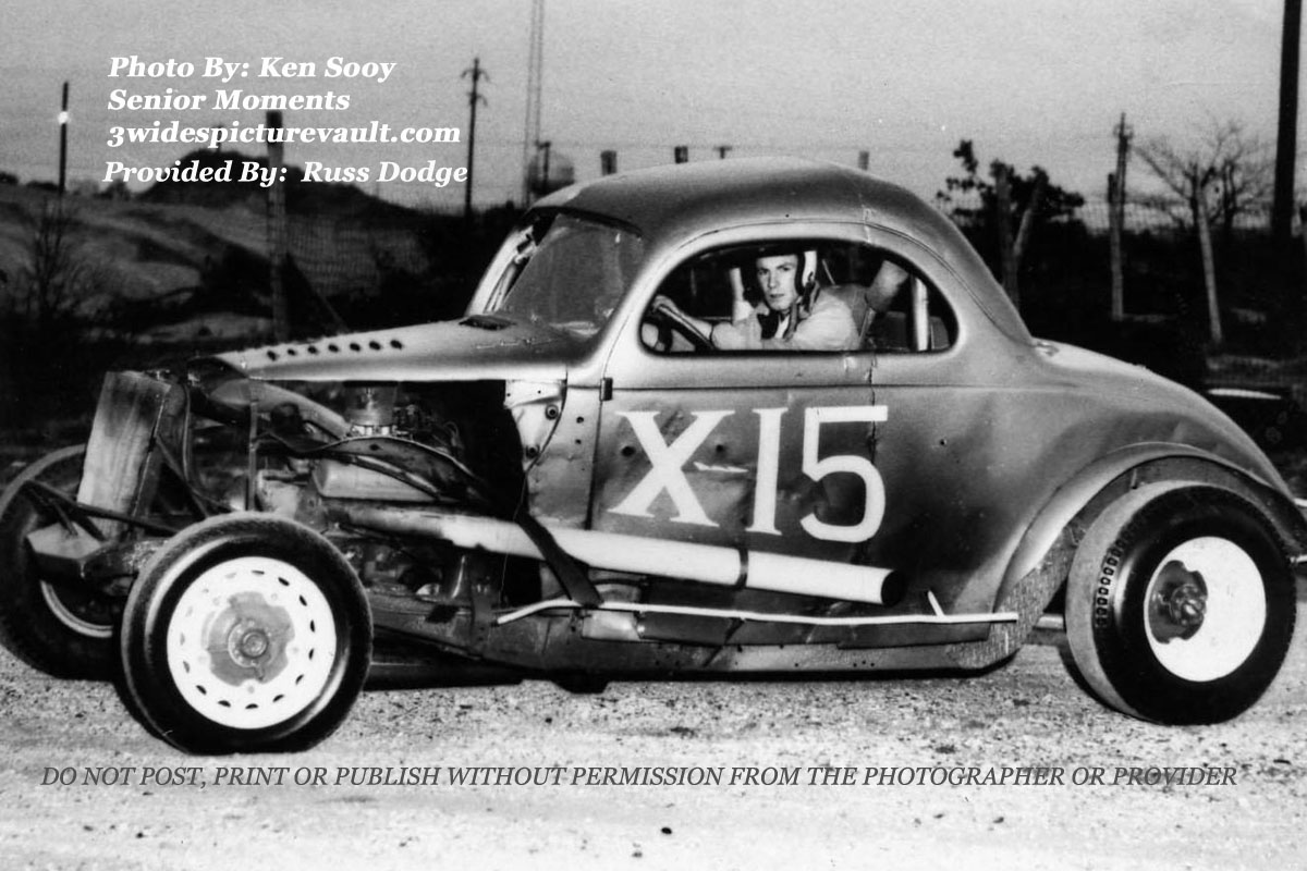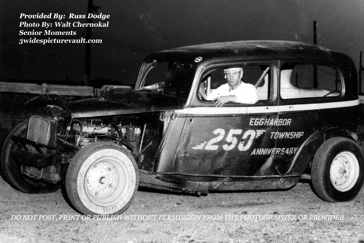 Seyler: Anniversary Edition Not Forgotten! In 1960 Egg Harbor Township celebrated its 250th anniversary. Showing community pride, Charlie Angerman Jr. fielded his unique hobby stock car using the number 250 to advertise the event. Using a ’34 sedan body (my guess of year) and a flathead six cylinder Ford, Charlie won 7 features in the limited division at Vineland Speedway. The “maroon rocket” had several unique set ups besides the body style. Note the clearance of the left frame rail and the high z’ed kick-up at the back. A large vacuum gauge was mounted where a tach would usually be placed and the car had a manual control cable set up on the distributor so that the spark advance could be controlled by the driver. He would use the vacuum reading to help adjust the timing as he controlled the power of the motor during the race. I recall it would usually take Charlie the full feature distance to pull off a win. Passing the flathead V/8 Fords within the last few laps, he had to run the high groove on the track all the way around to keep his RPM’s up on his flathead 6. I remember hearing at the time; the 250’s body was lost in a garage fire at the end of the season. The chassis was salvaged and it was used with a newer sportsman coupe X15. This car, with 1937 Ford coupe body shortened 8 inches, debuted at Vineland Speedways opener in 1961. The old flathead six had been replaced with a T-Bird engine and a 4 barrel carb! The X15 shortened coupe never handled or ran as well as the old sedan. The 250 anniversary car was one of those “magic combinations” that worked! Senior Moment by John Seyler |
