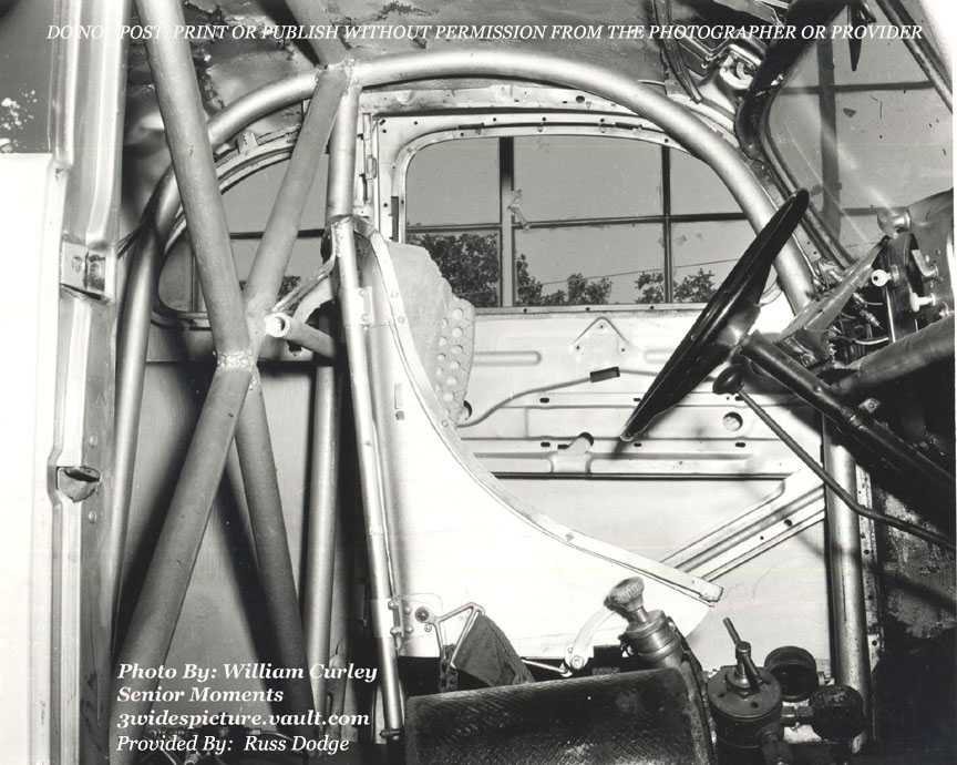 panel....that roll cage has been tested! Excellent photo showing the "office" for a typical Stock Car racer of the day. Thanks for sharing it! |