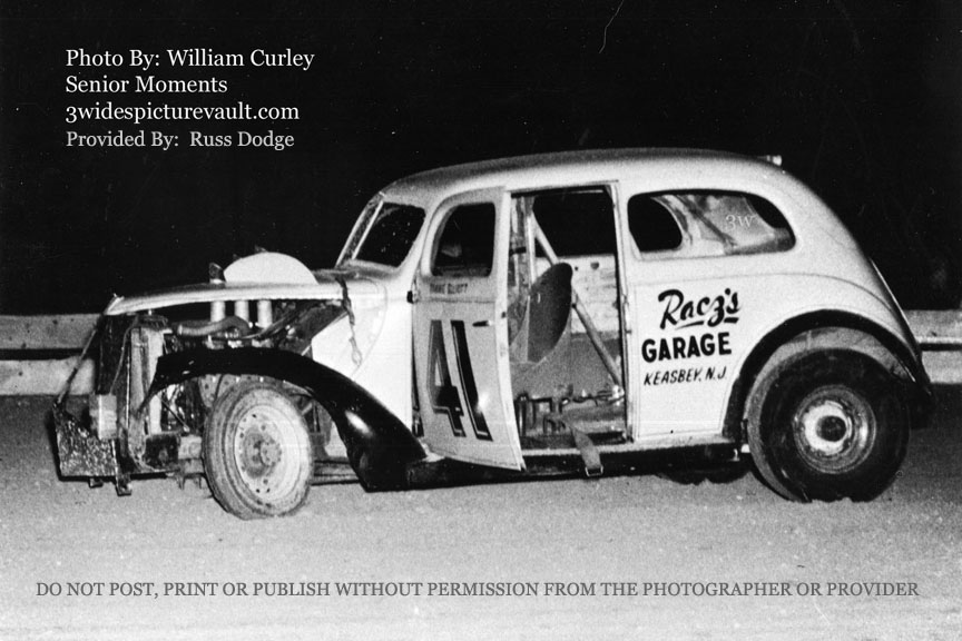 Come-On-In, the Door’s Open! Once again, William Curley provides the source of another Senior Moment with this photo of Joe Racz’s 41 at Vineland Speedway in 1956. It shows that even the best cars evolved with time in regards to driver safety. Most notably the addition of a cage, the replacement of the free standing seat and the widely used surplus seat belt, hanging out of the door after Tommie Elliott exited the car! My first memory of a Joe Racz 41, was seeing Pete Frazee at the wheel of one of the cleanest (and fastest) modifieds at Vineland Speedway on asphalt. I still remember the look of the car with a fuel injected Ford, hardly visible under the hood. It is what I remember as one of the first true appearing race cars I saw, rather than an old stock car body with a big engine installed. Coincidentally, at a recent Old Bridge reunion Pete reflected on Joe Racz’s cars with me. Pete said the flathead motor in the car pictured was the strongest flathead motor he had ever driven. The power stayed consistent the entire race, not lessening near the end, which was common at the time. He also reflected that Joe Racz had a separate room in the back of his garage where he built his own motors. Of interest was, Pete was not allowed in that room! Senior Moment by Russ Dodge Photo by William Curley Vineland Speedway 1956 |