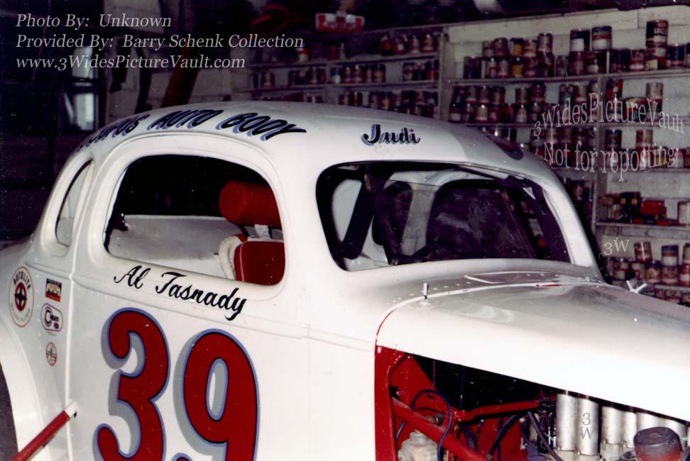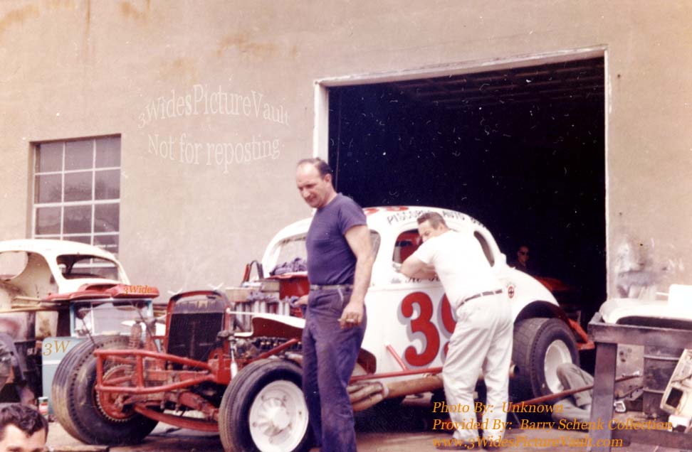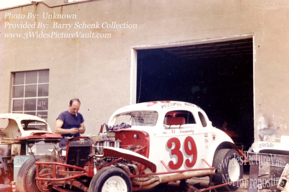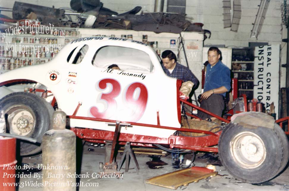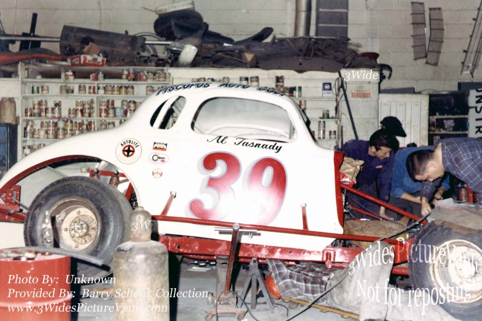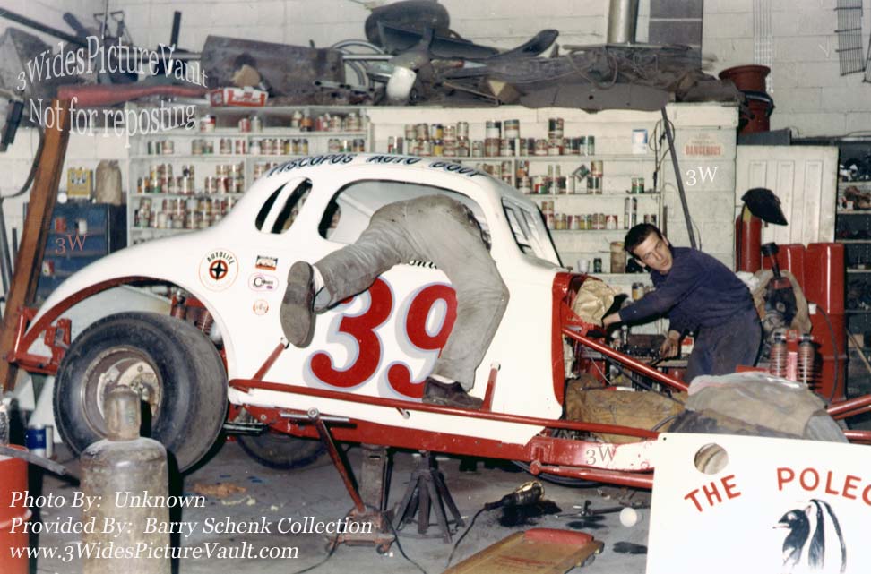 | 02.08.19 | Fred Menschner | This picture was taken at the Piscope Brothers Garage in Morrisville. Looks like they are in the process of rebuilding the #39 for Tas after Bud left. This was where the car was worked on and stored its back in the corner by the paint booth where the left over paint was kept. Could be Sam Digiuseppe, who did all the welding under the car and inside the car is Carl (Shakey) Hughes. One of people standing is John Zimba, a #39 crew member. Tas used a ton of left rear weight. |