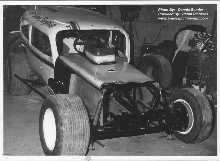 | Comments: | Great photo of a modified under construction. Not sure if this is a new frame for a used body, or what the circumstances were for this photo, but the car has the look of the #57 and/or the #19 the Kenny Brightbill drove.... which may have become the Bob Toreky #14... and may even have become the Billy Mathew's orange #57 sportsman that ran at Flemington around 1974. |