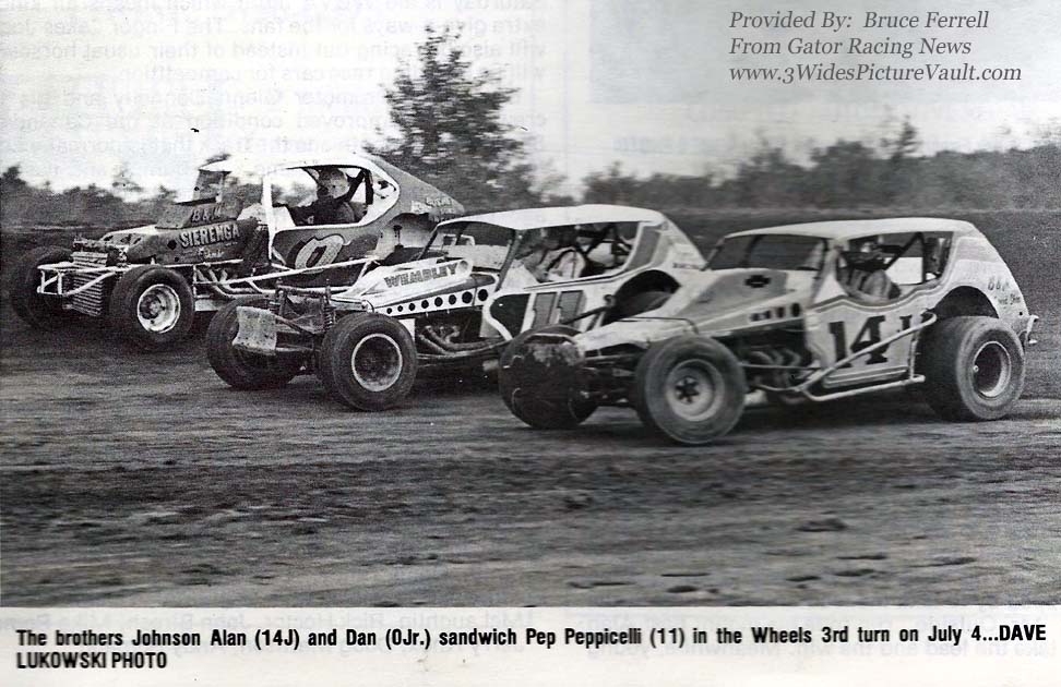| Comments: | Comment from Bruce: Black and white photo from Gater Racing News and has Alan in the newer "Circus Wagon" inside of Pep Pepicelli in the older car, now repainted white and renumbered 11. |