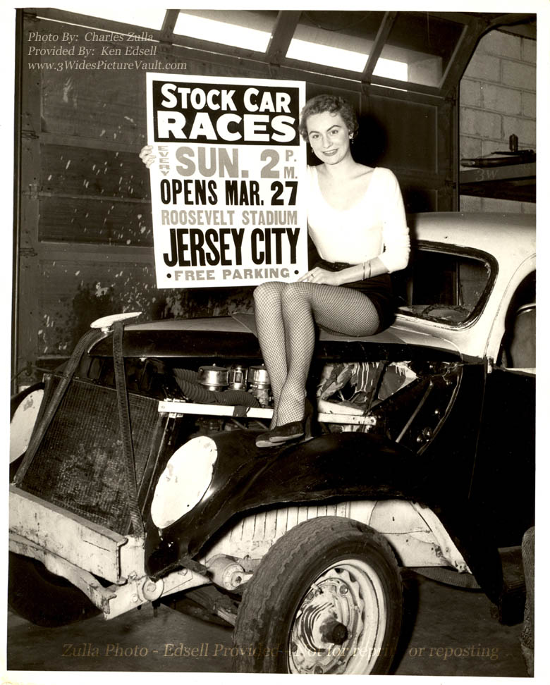 | Comments: | Comment: That's quite a hood ornament! Opening day poster for Roosevelt Stadium races being held by an attractive lady in this great Charles Zulla photo provided by Ken Edsell |