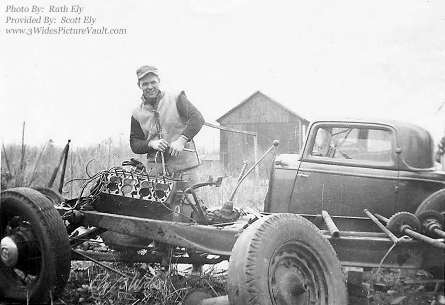 | Comments: | Comment from Scott Ely: This is a photo taken by my mom back in the early 50s of my Uncle Mel Ely. Mel, my dad’s younger brother, drove hot rods for my Uncle Clyde Kelly (married to Mel and my dad’s sister Georgiana). My dad lettered the hot rods that usually number 4. He always painted the Disney character Pluto on the side carrying a checkered flag. Looks like Uncle Mel is working on his next motor/chassis combination for the upcoming racing season at New Egypt (then it was asphalt), Arneys Mount or Hightstown (1/4 asphalt track that became East Windsor). |