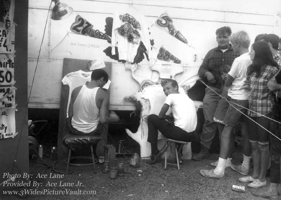 | Comments: | Comment: Great "non racing" photo from Flemington of Jimmy Grbac custom painting shirts somewhere on the grounds of Flemington Speedway. Folks are lining up to watch... The tall fellow might be Bill Young, who is the photographer of many great black and white photos found in The Vault. |