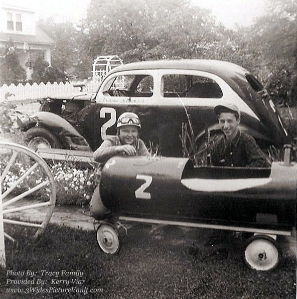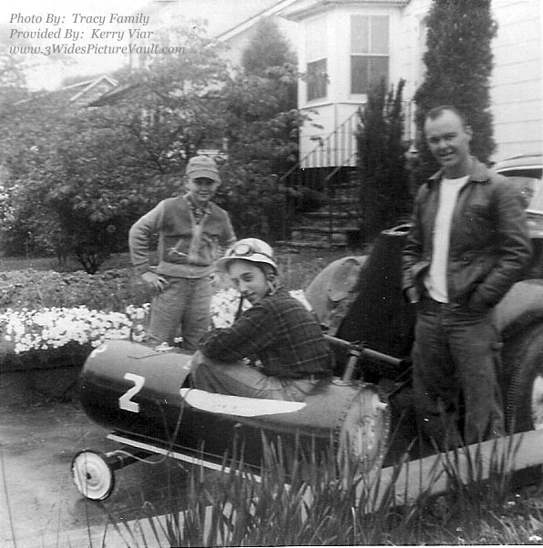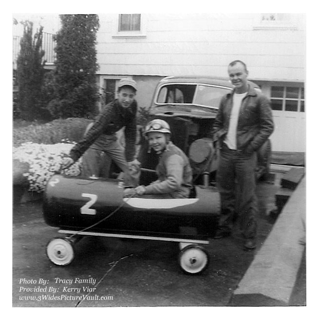 the way to do it. While we all may live in different places, and have our own favorite era of racing, I can guarantee that those of us over age 40 at one time or another sat on some kind of land/speed creation with the rope held firmly in each hand, while our buddies pushed us down the street or over the hill! Now to me, the center of gravity looks a little high on the rocket #2, but why listen to me when you've got Frankie Schneider around! Great original family photo that reminds us all of a different time. |